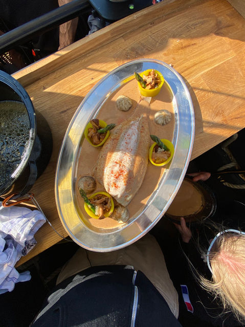 7h23, tout est fin prêt, c ‘est parti pour l’aventure, Olivier au Pilotage, Jean-Baptiste et Benjamin en cuisine et Thomas a la vidéo et au son. Le ballon s’envole doucement dans le ciel, nous commençons a cuisiner. Les nombreux entrainements réalisés au sol sur la recette nous aident car les circonstances peuvent facilement faire perdre le fil. Olivier veille à axer la montgolfière et les parabole en plein axe de viseurs, impressionnant de maîtrise, c ‘est du grand art . Benjamin travaille directement sur la farce fine aux langoustines, Jean-Baptiste sur le fumet de langoustine et les canon de pomme de terre, directement mis a cuire également. il est 7h55 et on voit de la vapeur se dégager par le couvercle des casseroles, c ‘est une joie immense , ça marche. S’ensuivent réduction du fumet, tournage de champignon et cuisson de la garniture. La belle sole est désossée par Jean Baptiste puis farcie par benjamin puis mise à cuire à court mouillement . le paysage est splendide , la vue de la cuisine ouverte époustouflante; Pendant ce temps les canons de pomme de terre sont garnis et mis à feux doux (en désaxant verticalement les paraboles) . les rayons du soleil sont de plus en plus fort et l’ appoint de cuisson de la sole (65°c) est atteint en 16 mn de cuisson. il est 8h42 . La sole est débarrassée puis parée, la réduction de fumet montée au beurre . le plat est dressé avec une joie non dissimulée . L ‘ equipe vient réaliser la première cuisson solaire en vol, quelle joie !